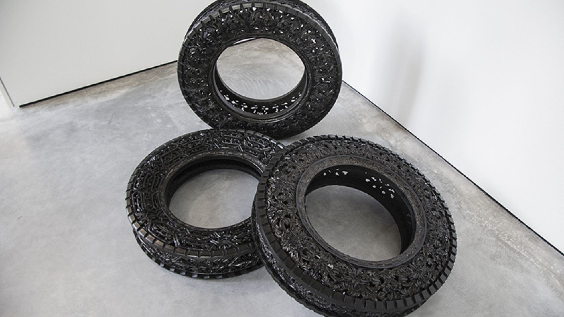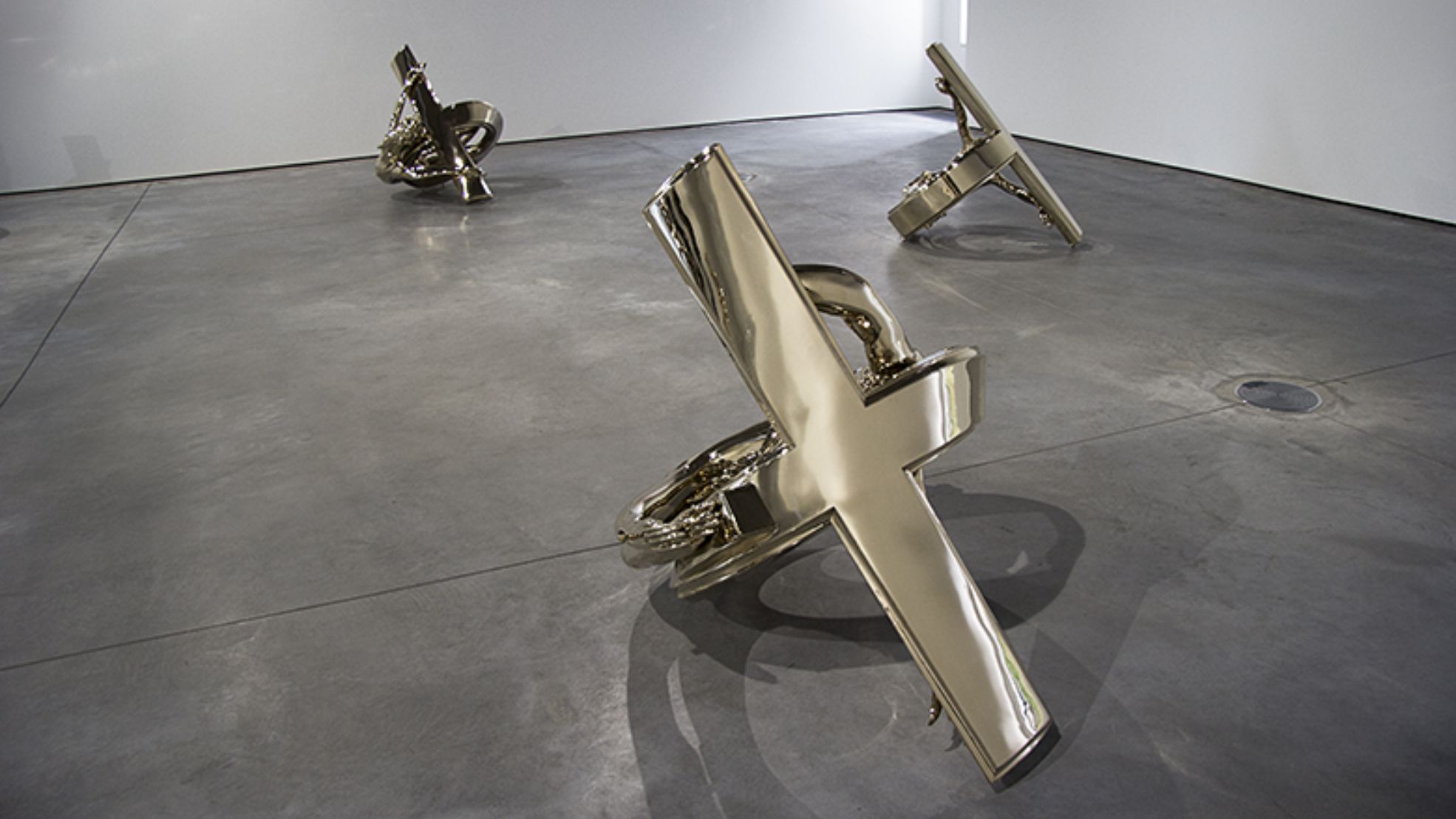 Удивляется распятиям, скрученным в кольца, которые наделали немало шума в Лувре несколько лет назад, и покрышкам, которые тоже вышли готичными. Свои работы в этот приезд Дельвуа выставил и в ГМИИ им. Пушкина: его газовые баллоны и прочие громоздкие, не вполне себе эстетические предметы человеческого обихода расписаны под античность и классику и вписаны в контекст экспонатов постоянной экспозиции Пушкинского.
