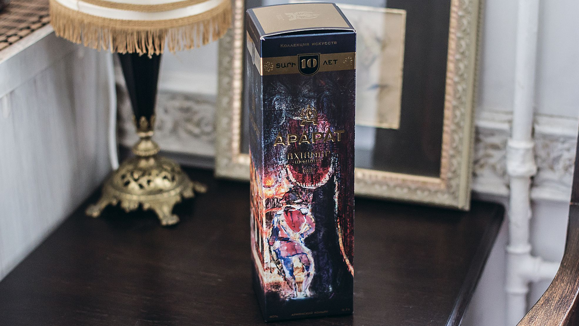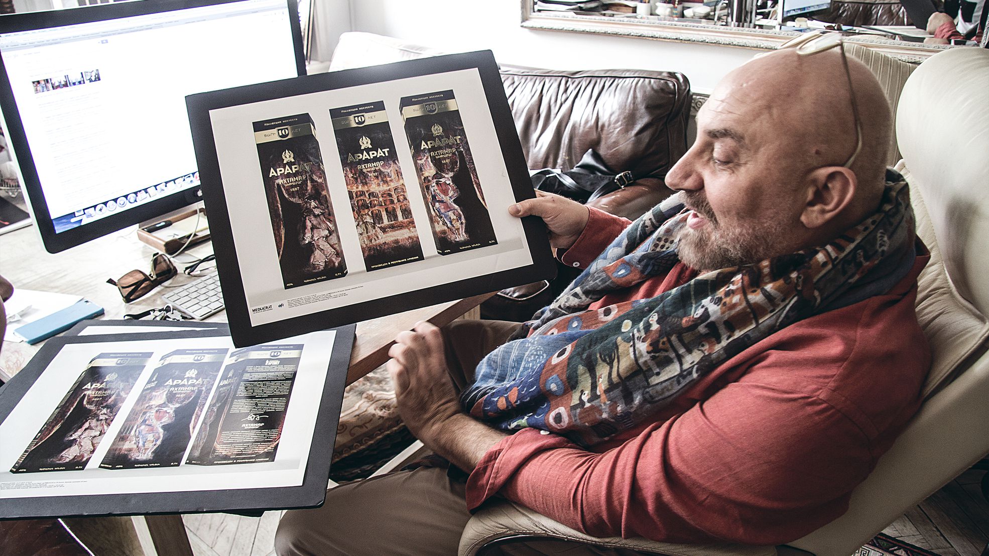 «Мы долго думали и работали над этим проектом с упаковкой. В своё время дизайн для коньяка «АрАрАт» был посвящён Параджанову. В этот раз мы решили сделать реверанс в сторону русского театра. На столе появился занавес театра кукол, который я когда-то придумал. Специально для этого случая я внедрил в макет персонажей. Получилось всё очень воздушным, расплывчатым, как во сне. Со мной работал хороший дизайнер: он разложил всё так, что три коробки вместе стали работать как театр. Получилось трехмерное пространство. Знаете, мы как будто нашли новые грани театра».
