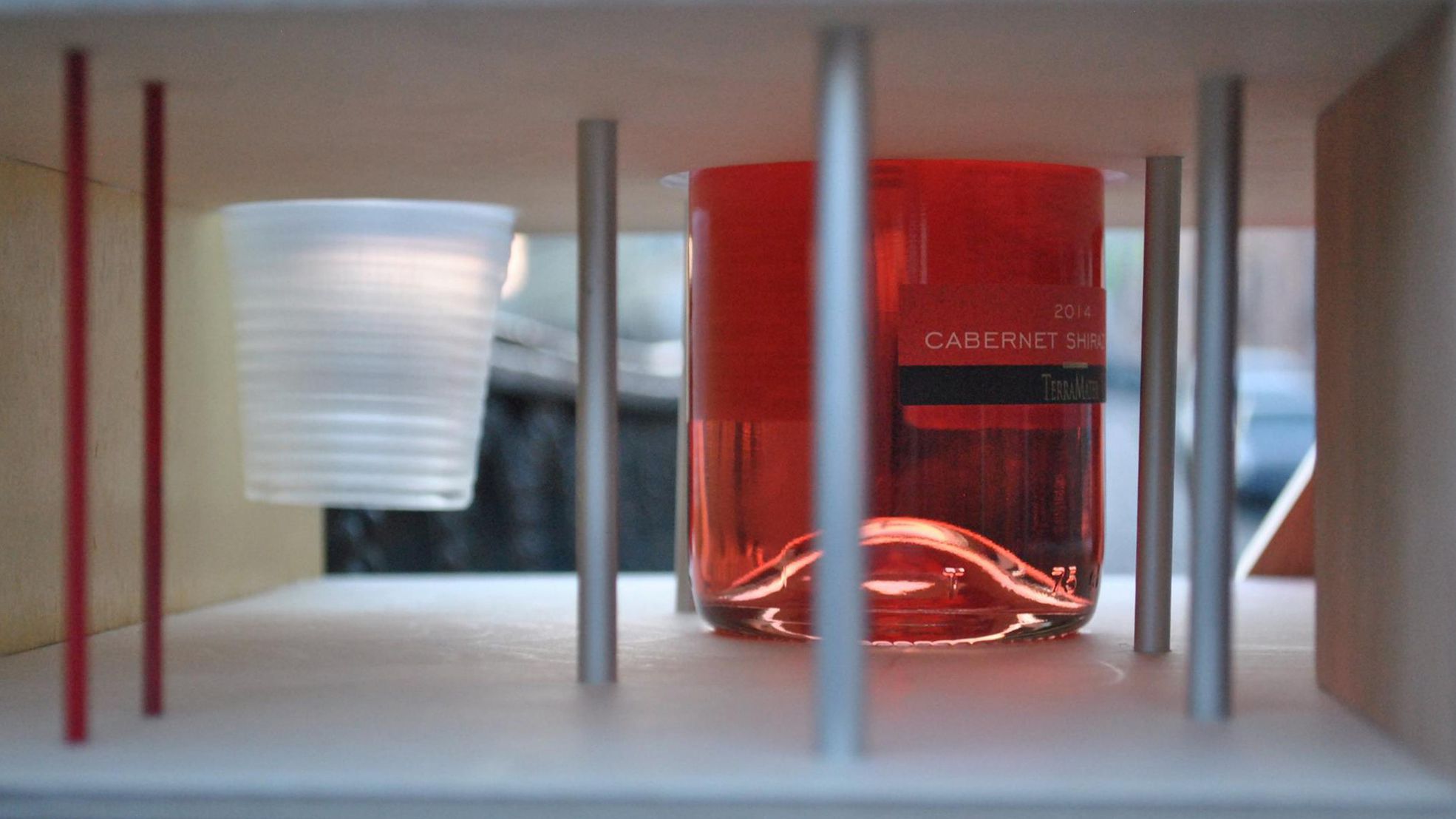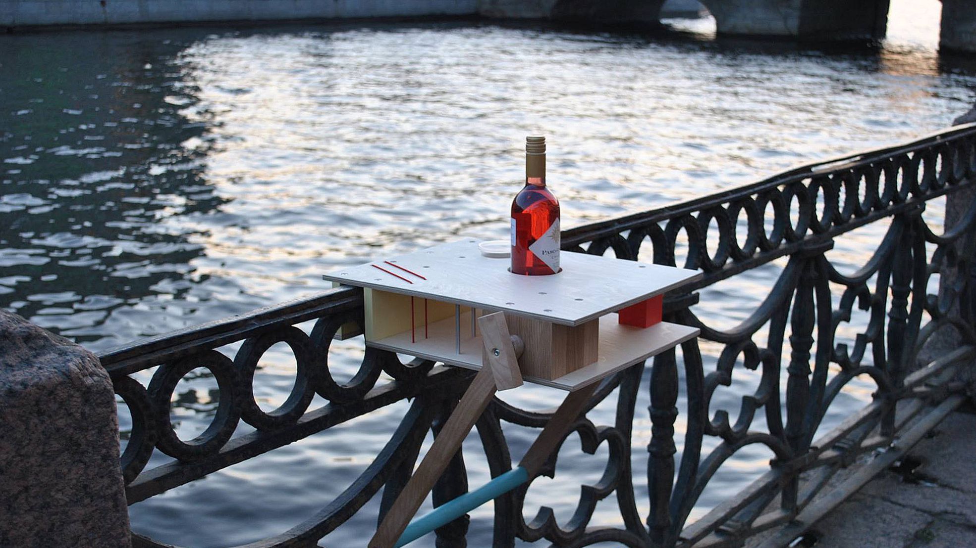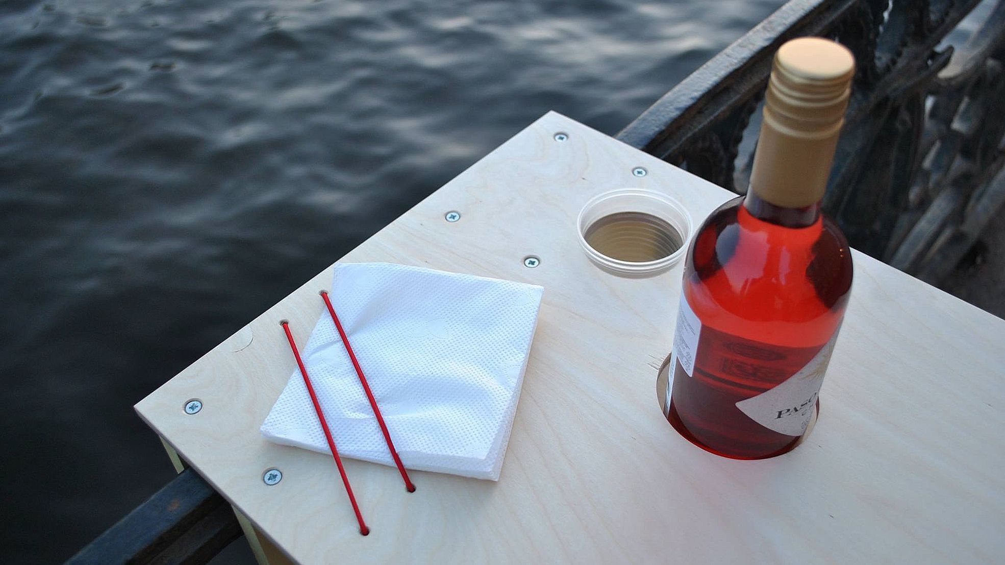Архитектурное бюро Rhizome представило концепцию стола, предназначенного для распития вина на набережных. Это чудо крепится к перилам. В столе имеет специальные отверстия для стандартной бутылки, бокалов и держатель для салфеток. На крышке можно разложить закуски. Конструкция позволяет положить бутылку внутрь столика, когда он находится в сложенном состоянии.