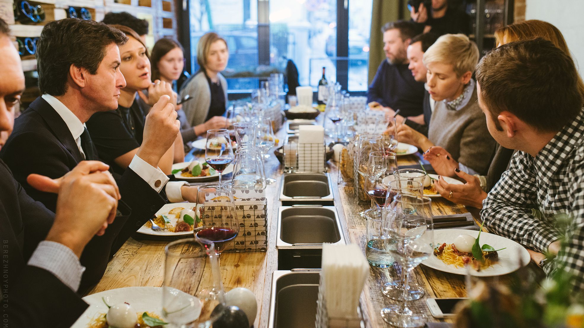 Официанты внесли первое блюдо. Куриный паштет. Его полагалось съесть, запивая Cune Gran Reserva 2008. Логично. Паштет был упакован в сферу на манер отварного яйца. Компанию ему составлял ореховый инжир. Куриное мясо прекрасно рифмовалось с немного бальзамическими нотками вина. Это вино — нежное, округлое, как яйцо, где во вкусе легко угадываются черные ягоды, которые в свою очередь, – прекрасная пара инжиру и тостам из белого хлеба.