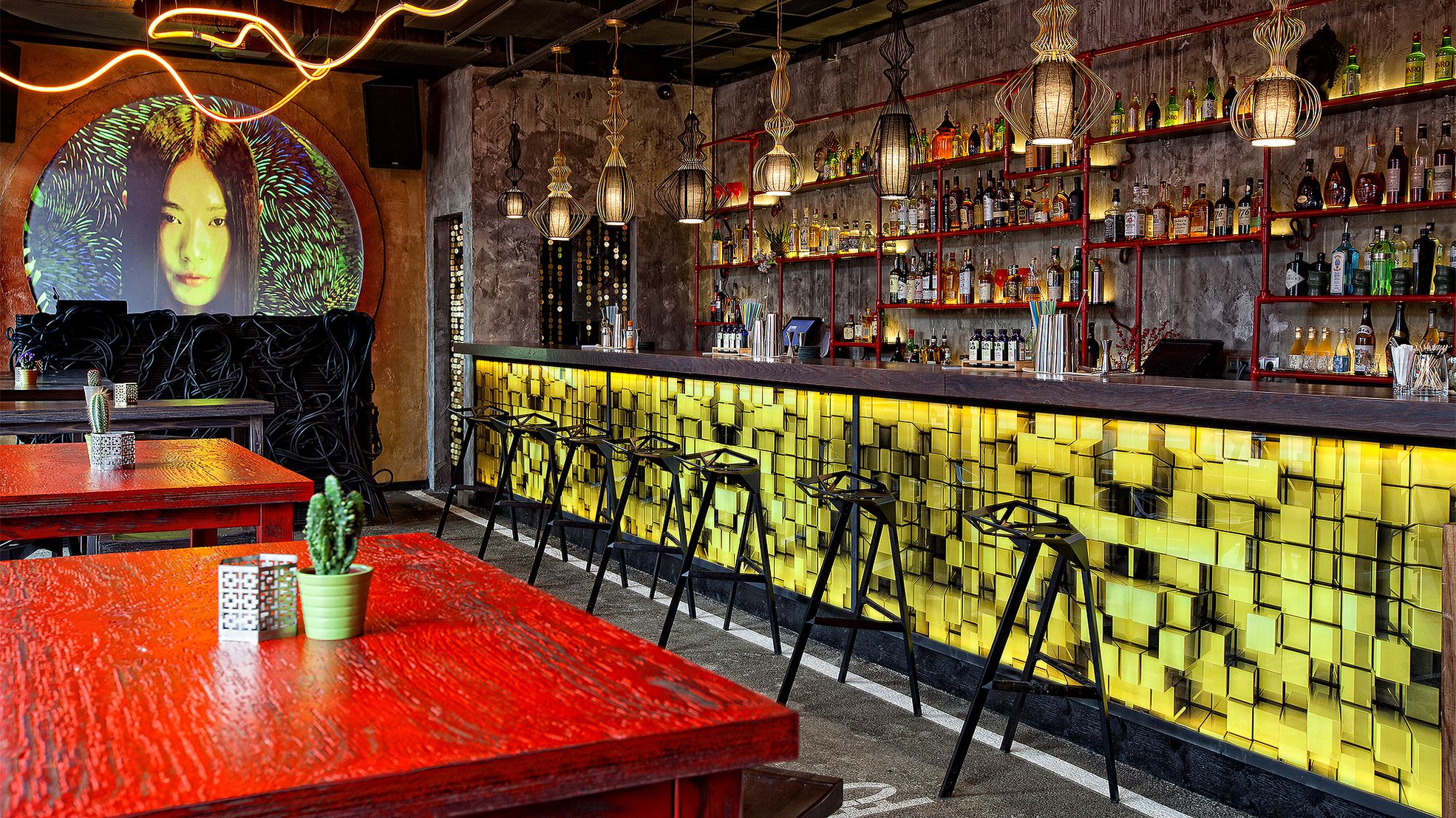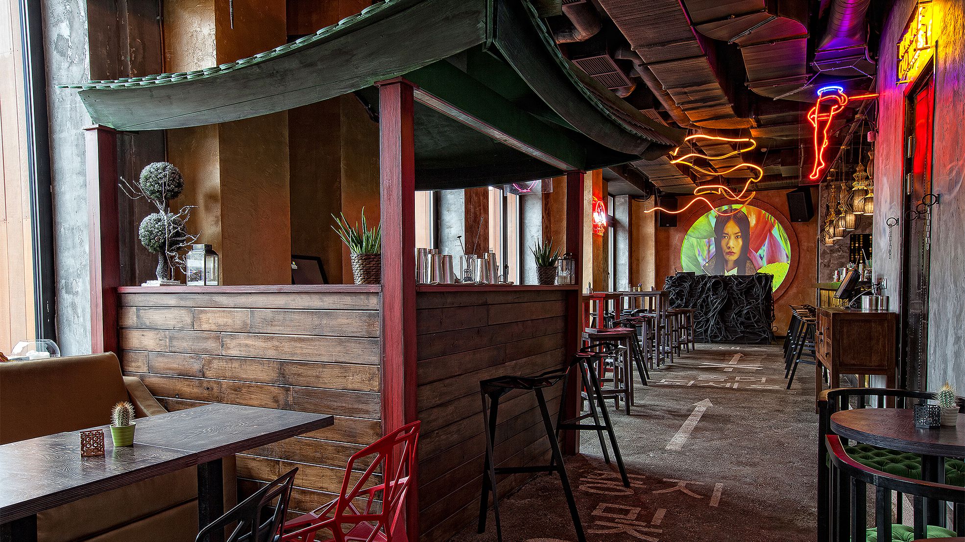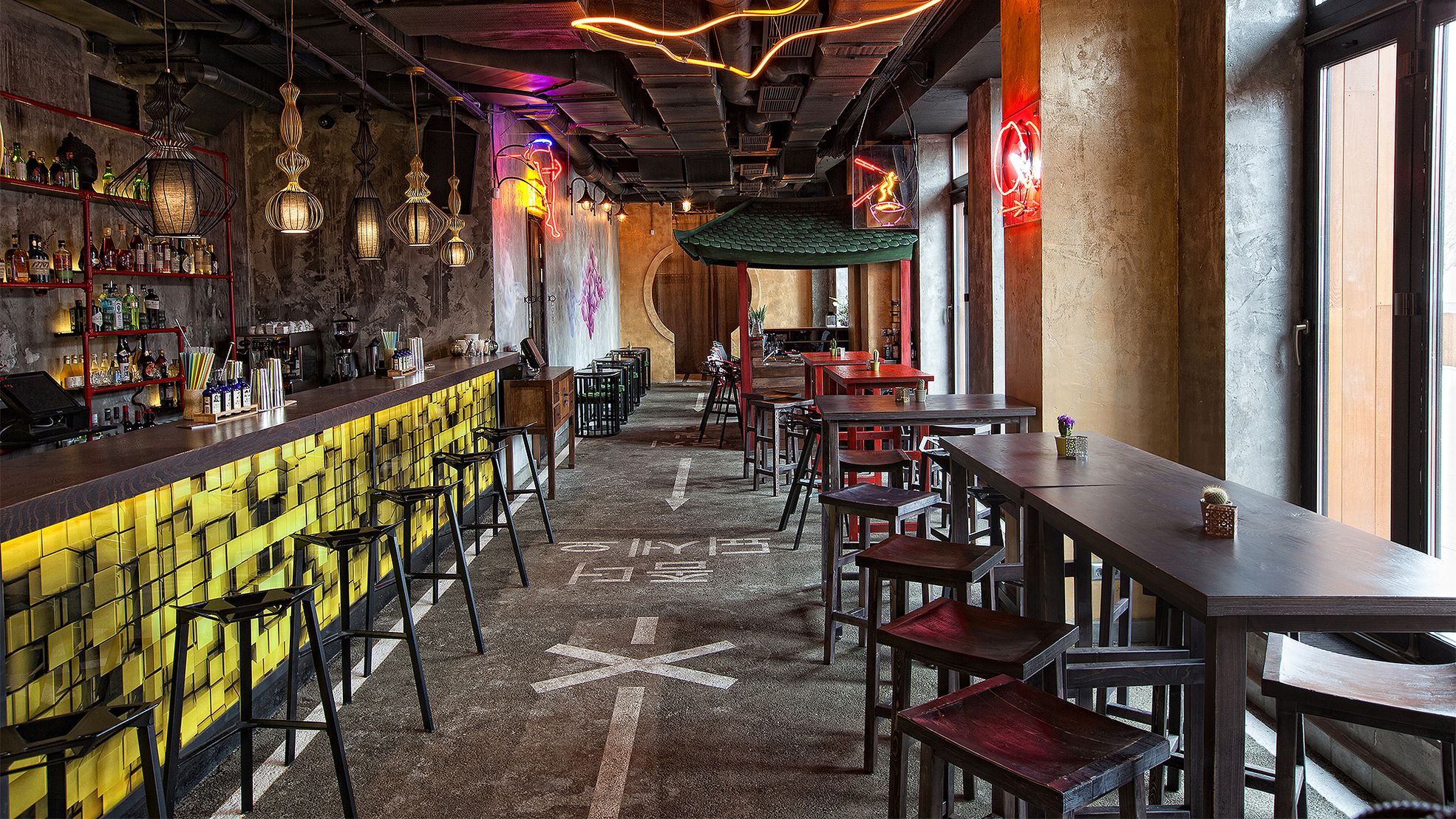 Приглушенный свет. Неоновые вывески. Асфальт вместо полов. Надписи на корейском. Бар Koba — чуть шире дорожки для боулинга. Здесь танцуют, пьют красивые коктейли и слегка закусывают азиатской едой.
