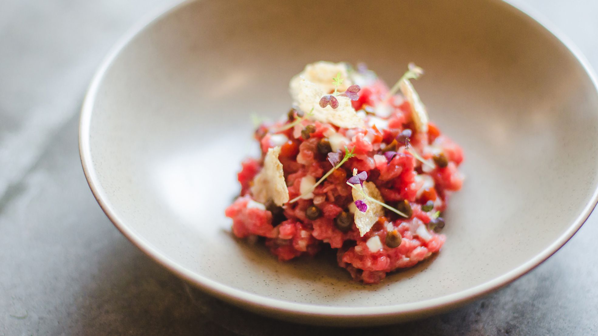 Тартар из оленины с изюмом и муссом пекорино— 390 р.; севиче из тунца с дайконом и терияки— 390 р.; телячьи мозги с грибами— 350 р.; филе говядины с коньяком, костным мозгом и печеными овощами— 650 р.; мусс из сыра Таледжио с грушей в белом вине— 190 р.