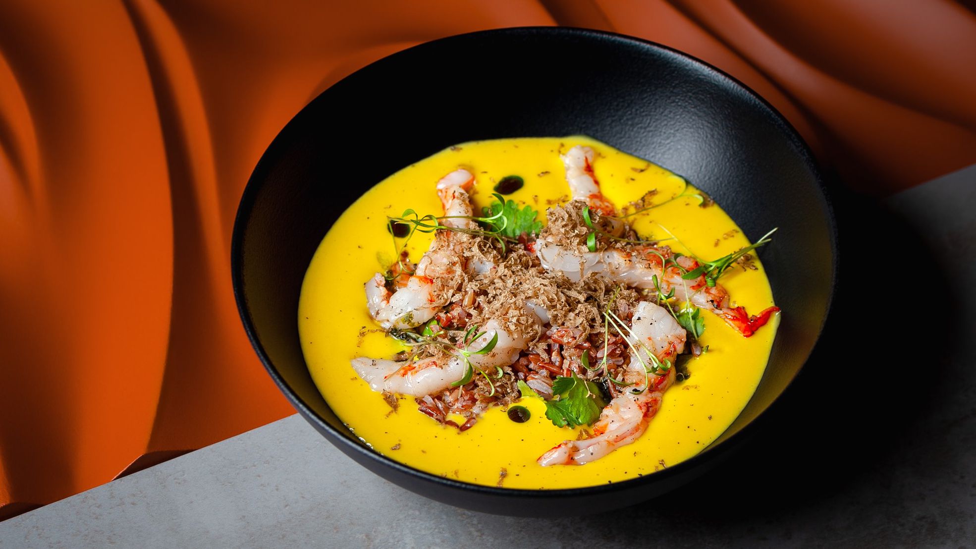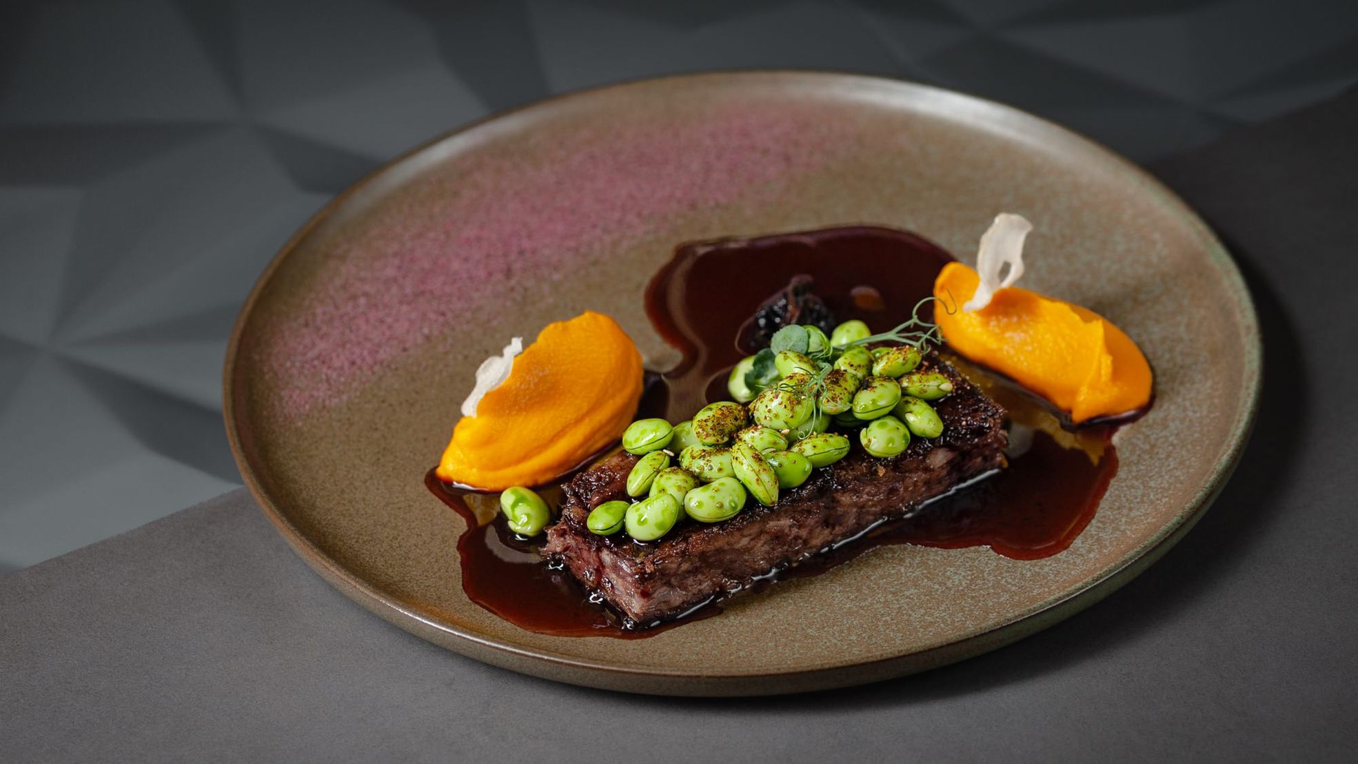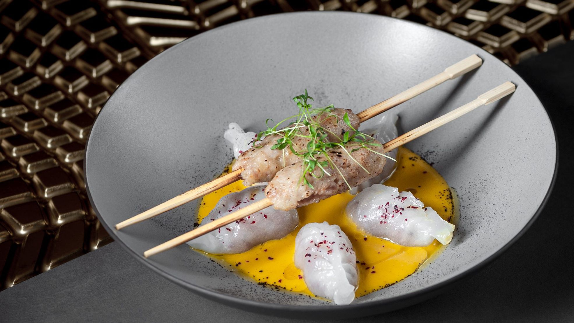 Тем, кто придерживается зеленой позиции в питании адресован запеченный баклажан со спайси йогуртом, морковью и имбирем (600 р.). Готовится он с японской смесью семи специй шимичи и подается с сублимированной малиной и чипсом из яблока.