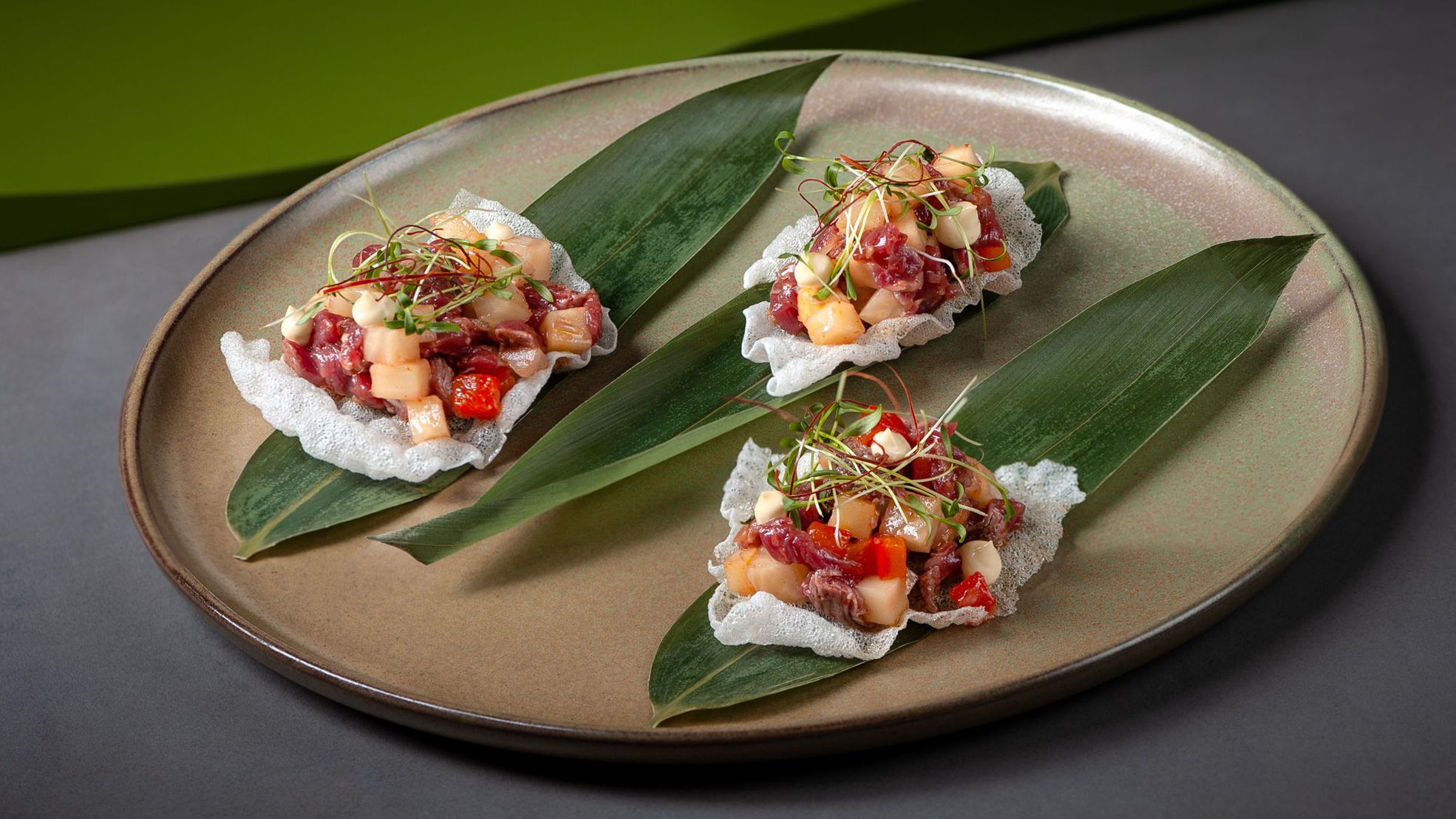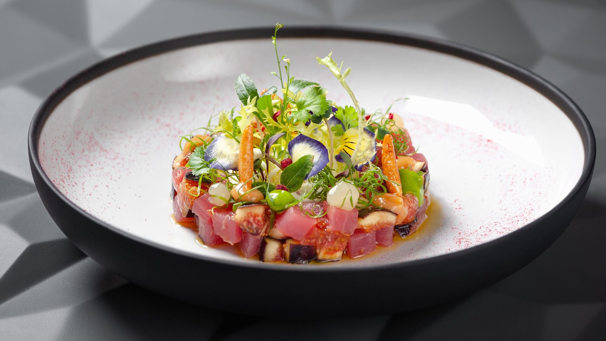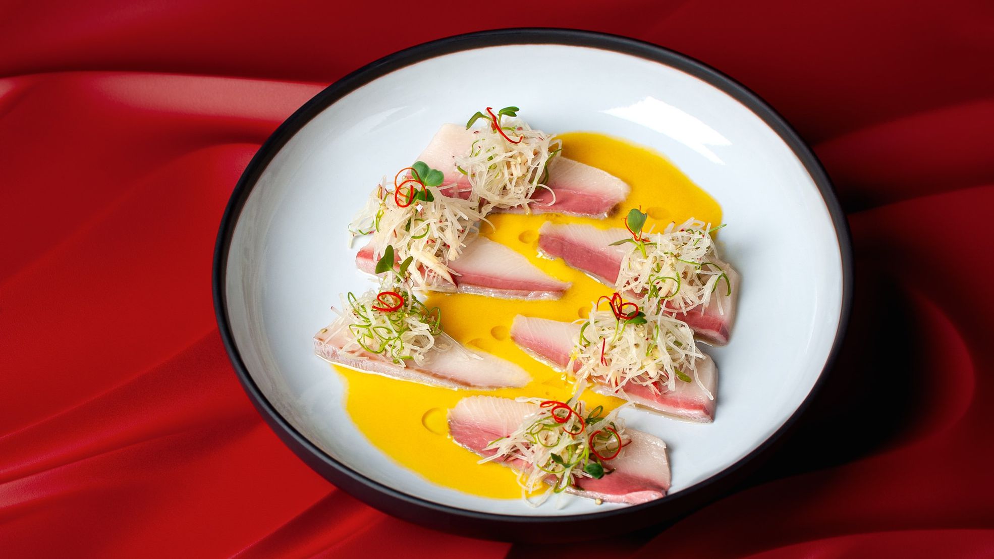 Тем, кто придерживается зеленой позиции в питании адресован запеченный баклажан со спайси йогуртом, морковью и имбирем (600 р.). Готовится он с японской смесью семи специй шимичи и подается с сублимированной малиной и чипсом из яблока.