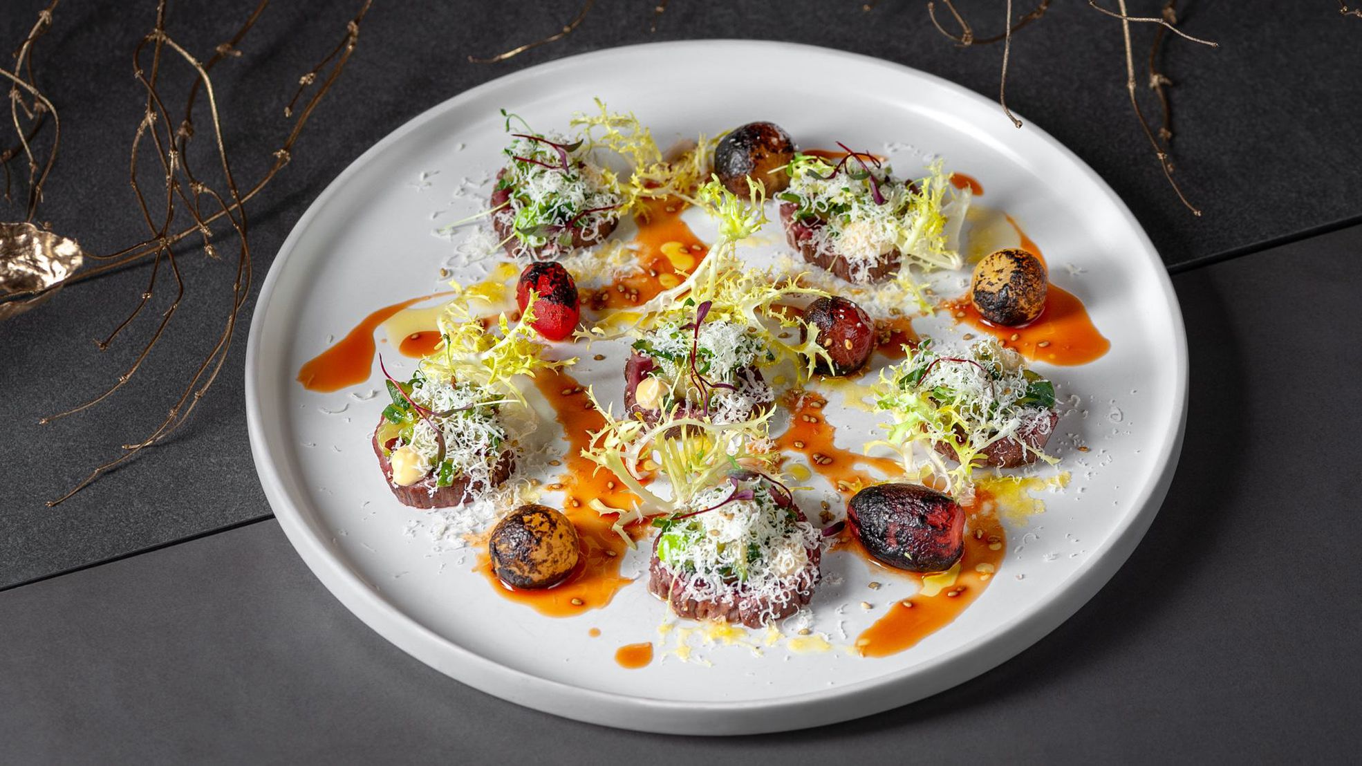 В разделе димсамов пополнение – димсамы из тонкого рисового теста с куриным кебабом и соусом карри (600 р.). Седло ягненка миксуют с аджапсандалом на итальянский манер и сметанным соусом из кинзы (1300 р.), томленую говядину – с морковным пюре, бобами эдамамэ, соусом демигляс, бузиной и гибискусом (1200 р.). Ризотто из сельдерея подают с ягненком и соусом перикаро (600 р.), а филе говядины – с брокколи, фуагра и трюфелем (1950 р.)