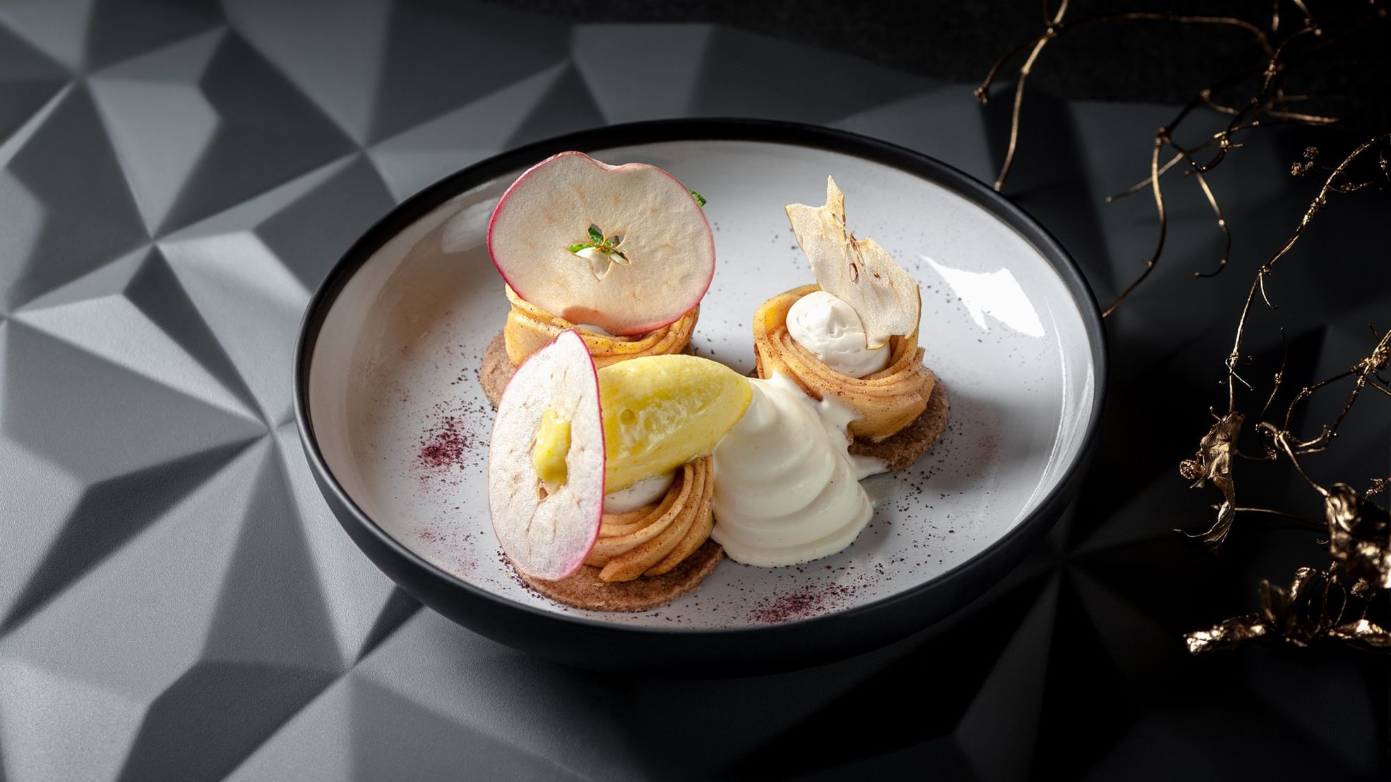 Раздел десертов не остался в стороне. Теперь можно попробовать тирамису с лавандой и чаем матча (450 р.) на основе экстракта лаванды и яблочный татен с кремом из кальвадоса (450 р.).