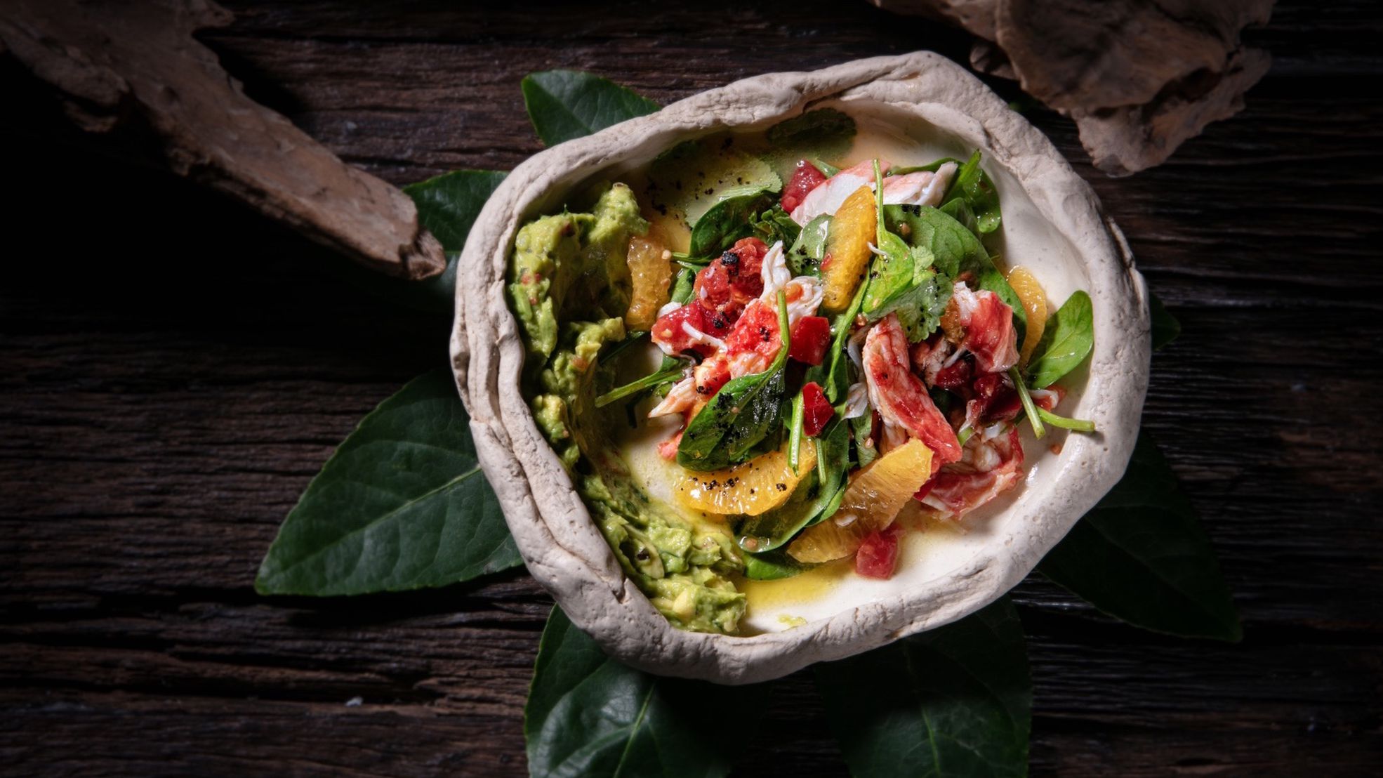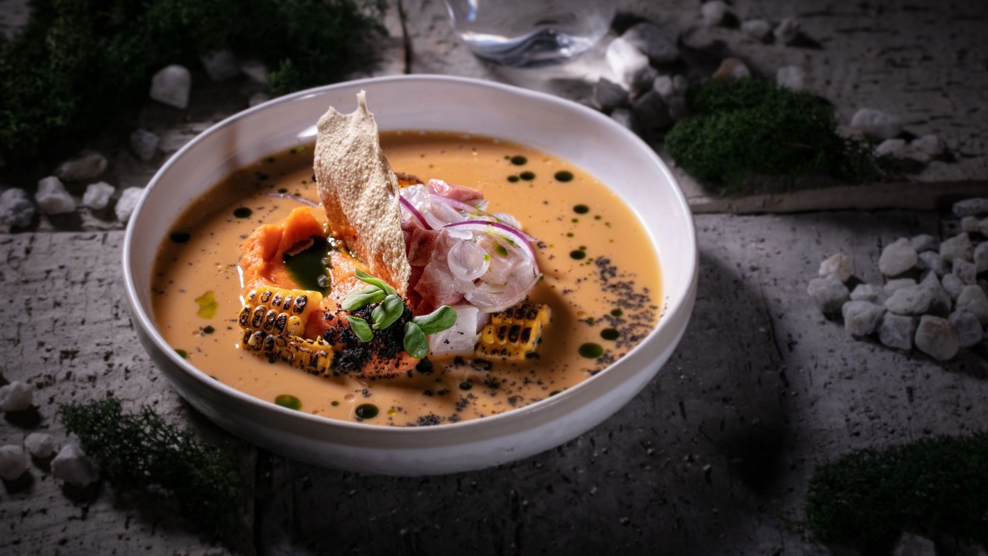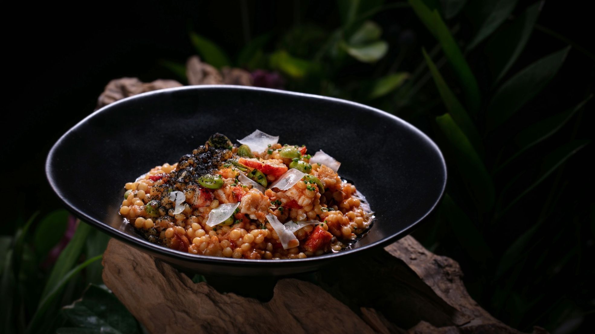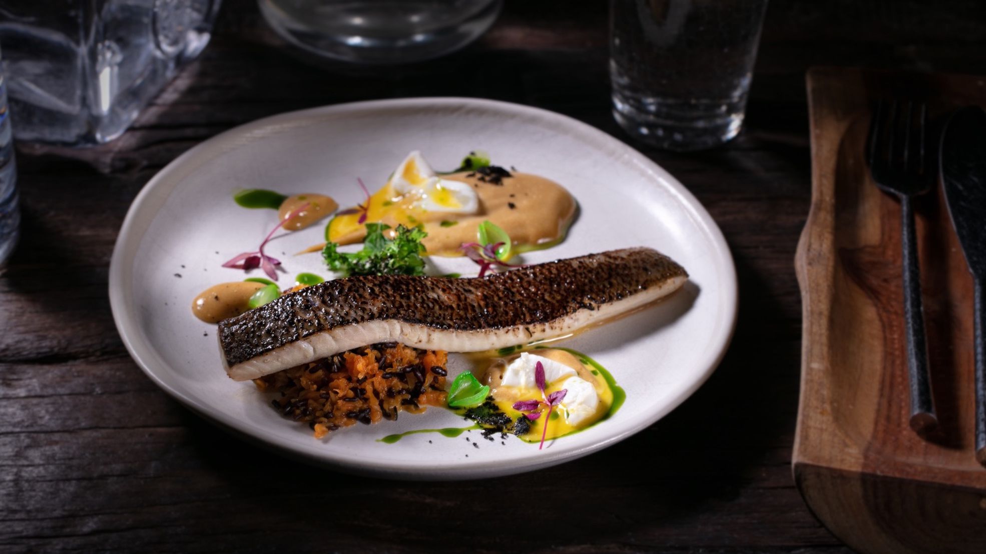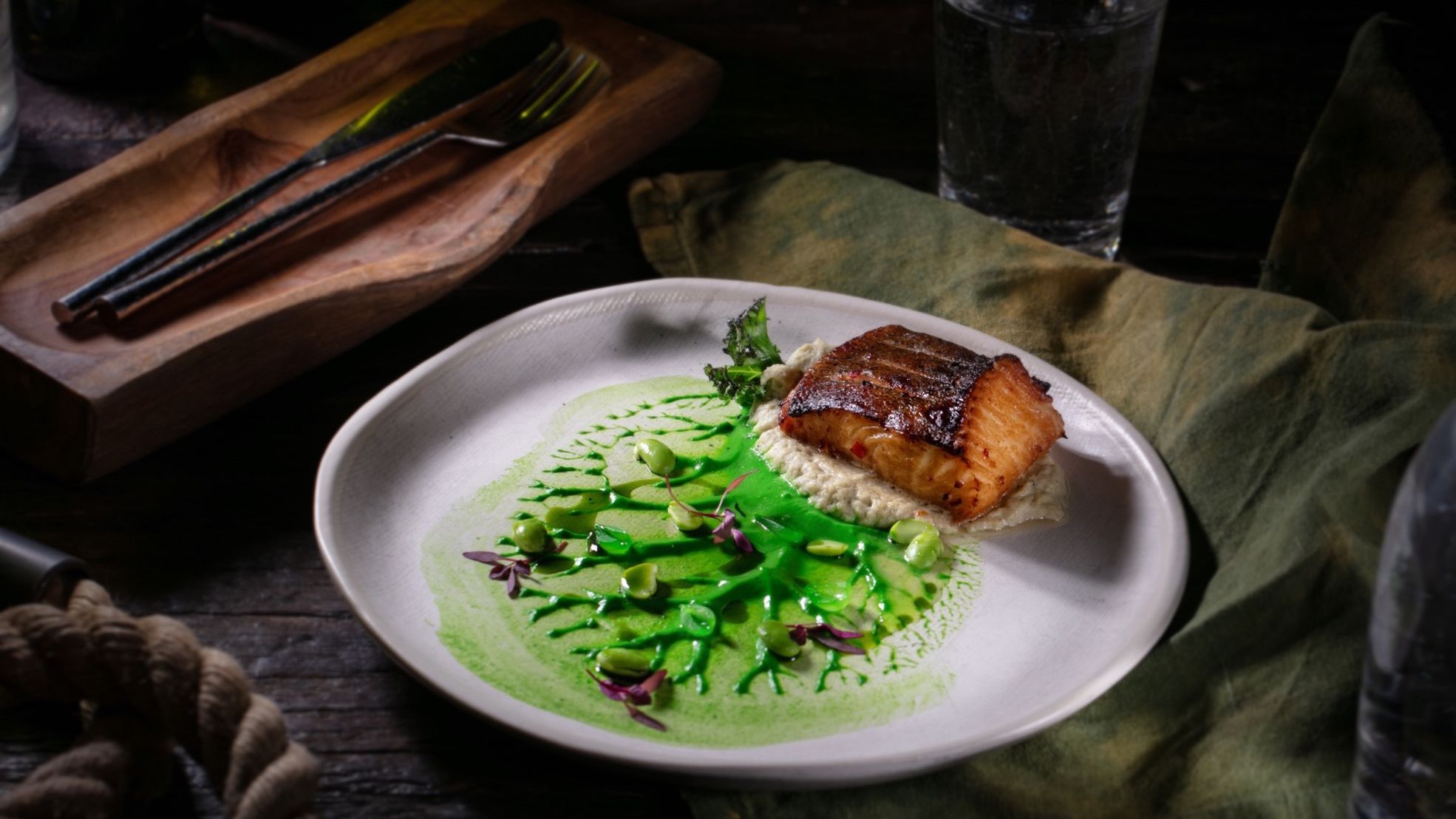 Евгений добавил салат из краба и шпината с мандаринами, авокадо, вялеными томатами и цитрусовым соусом (870 р.) и севиче из дорады с кукурузой, бататом и чипсами из чечевицы (640 р.). Стоит обратить внимание на палтуса со шпинатом, картофелем, трюфелем и бобами эдамамэ (870 р.). Для этого рыба маринуется в пряном маринаде на основе корня галангала с перцем чили, картофельное пюре замешивается с черным трюфелем, а шпинат взбивается в соус. Тему морепродуктов продолжает маринованная в цитрусовом соусе спинка мускуна, с рисом неро-венере, тыквой и перепелиным яйцом (870 р.). Для соуса Чередниченко смешивает апельсиновый фреш, мед, бадьян, желток, оливковое масло и соус унаги. Финальным штрихом шефа стала крупа птитим с гребешком, крабом, соусом биск, вялеными томатами и пудрой из чернил каракатицы (850 р.).
