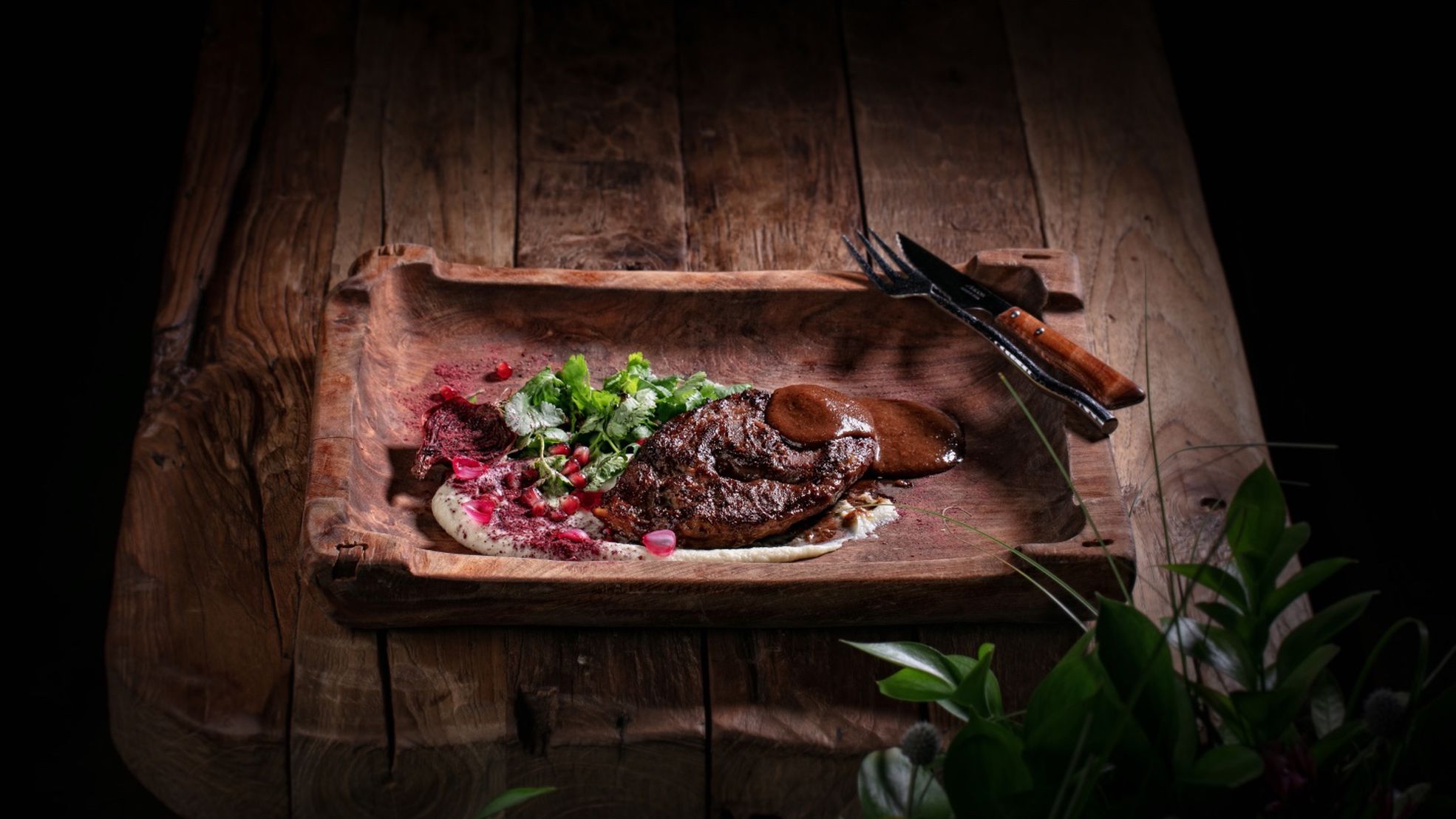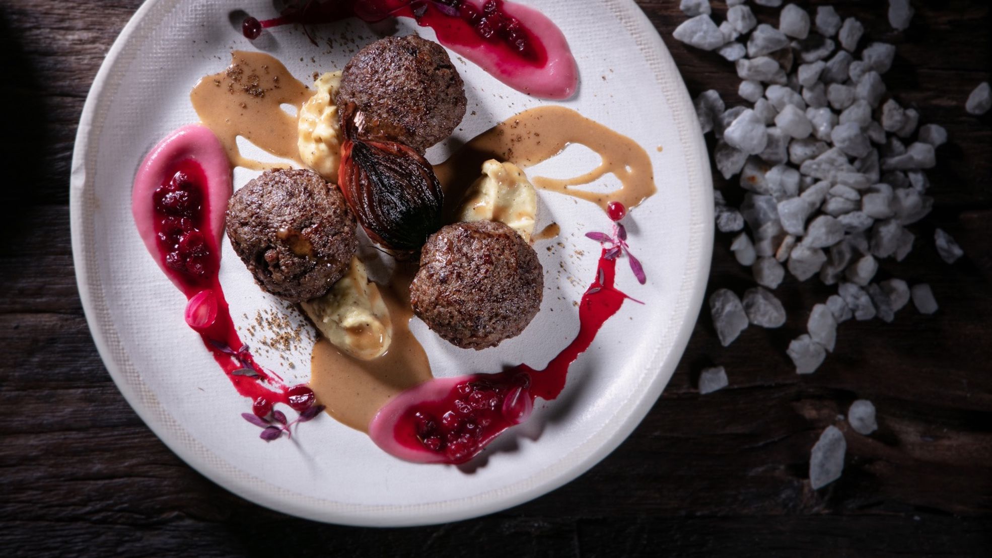 В мясные блюда шеф включил томленого ягненка с пастернаком, гранатом и соусом из копченых фиников (1100 р.), который готовится с добавлением барбариса, кумина, паприки и корня имбиря. А еще котлеты из оленины с пюре из можжевельника, сморчками и брусникой (730 р.)