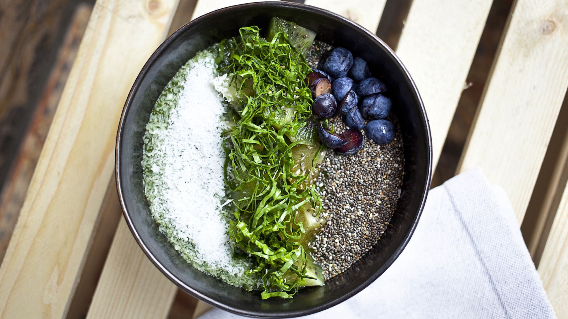 Следом идут смузи боул из шпината, киви и авокадо с кокосовой стружкой, голубикой и семенами чиа (430 р.). А вот кокосовый мусс с семенами чиа и свежей малиной дополнили стевией (450 р.) получился сладковатый: свежий йогурт, больше похожий на крем.
