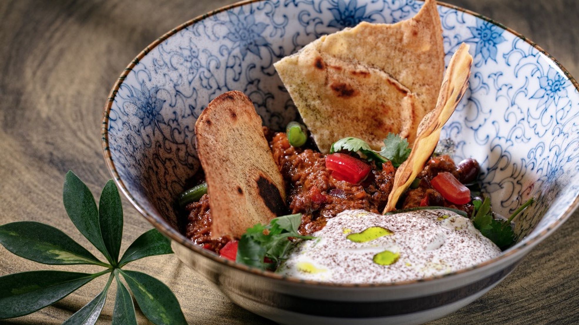 Для техасского чили кон карне лепешку шеф подсушивает на манер начос, а говяжий фарш долго томит с фасолью, гвоздикой, бадьяном и, конечно, с какао порошком, а подает с копченой сметаной (890 руб.).