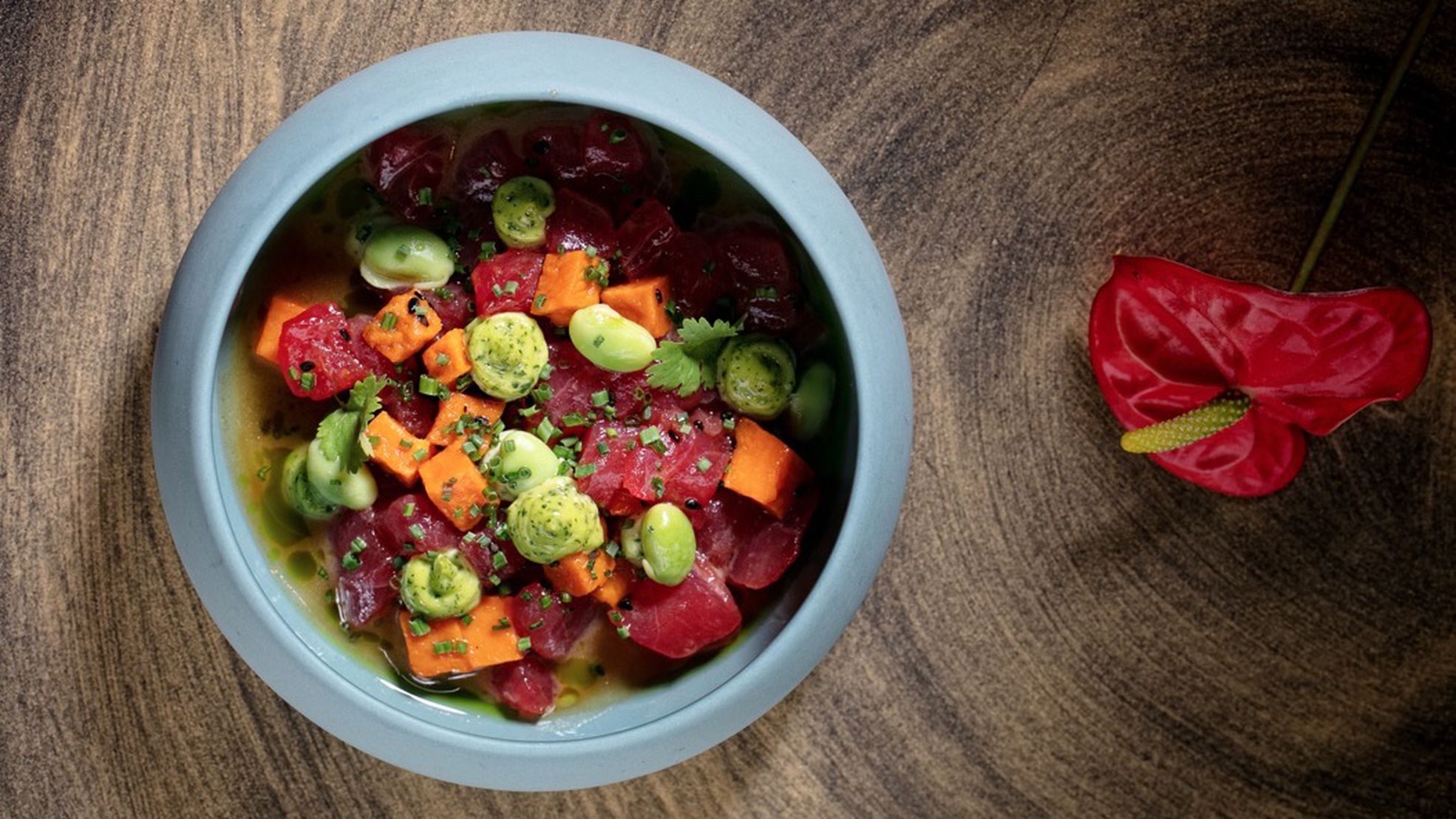 Перуанские севиче готовят из тунца с печеным бататом, мятным айоли и понзу на грейпфрутовом масле (620 руб.) и из сибаса с манго, луковым айоли и чипсами из киноа (790 руб.).