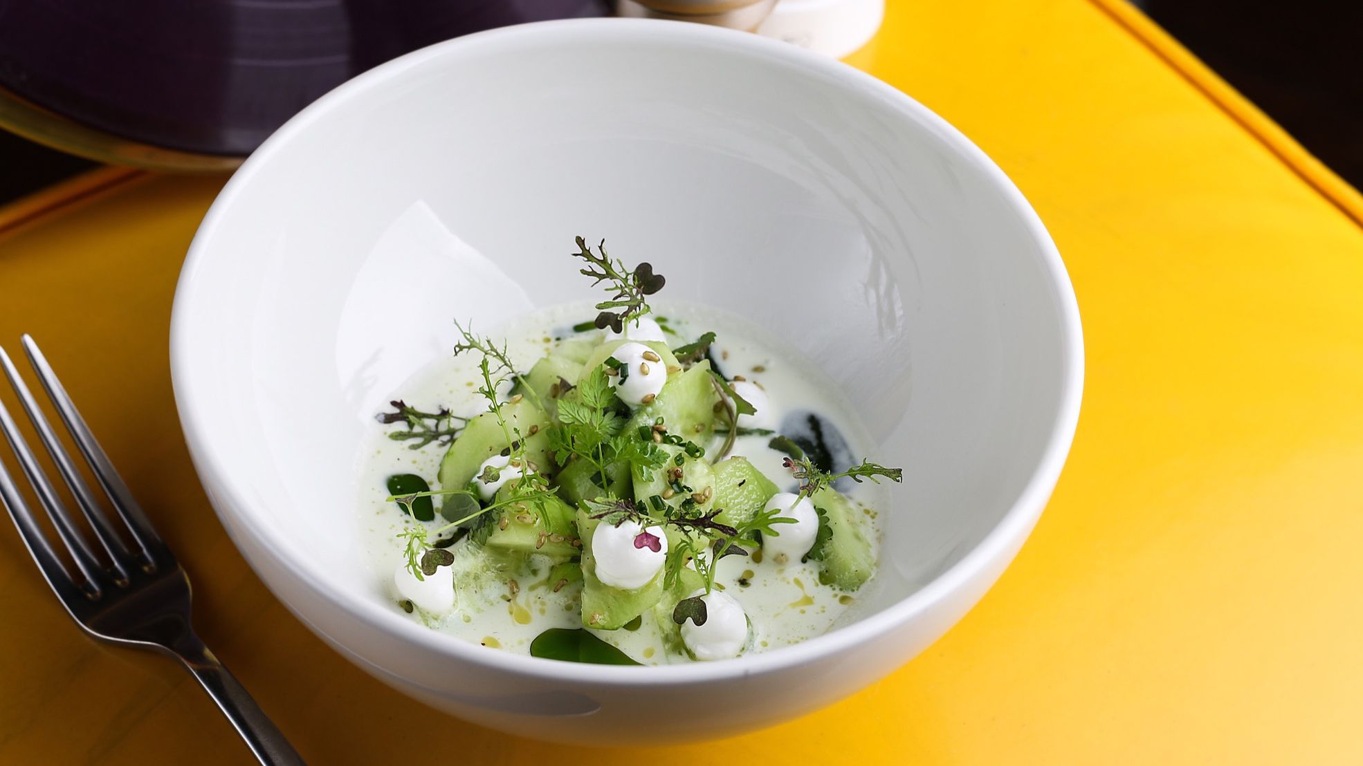 В холодных закусках главная поль у севиче – шеф придумал три вариаций. Первое Андрейченко готовит из свежего огурца с соком юдзу, маслом виноградной косточки, кунжутом-васаби и муссом из козьего сыра (490 р.), второе – из гребешка с соусом из томатов и клубники (750 р.), в третьем же шеф в композицию с лососем вписал авокадо, огурец, кинза, маринованные чери, кунжут-васаби, красный чили и соус из кокосового и тигрового молока (690 р.). Плюс, добавили хумус с лисичками, картофельным паем и зеленым маслом (350 р.) и легкий гаспачо с креветками (690 р.).