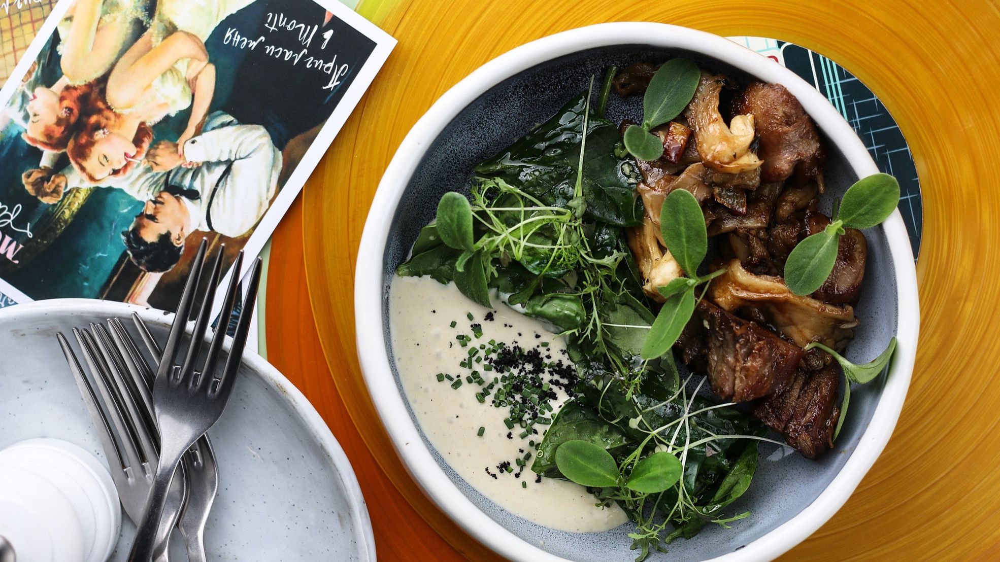 Язычки ягнёнка с эспумой из белых грибов (770 р.), телятина с вишневым демигласом и пюре из сельдерея (710 р.) стали новыми героями горячих позиций. Для первого белые грибы и вино шеф превратили в нежную эспуму, сделав ее гарниром, а для второго из вишни приготовил мясной соус.